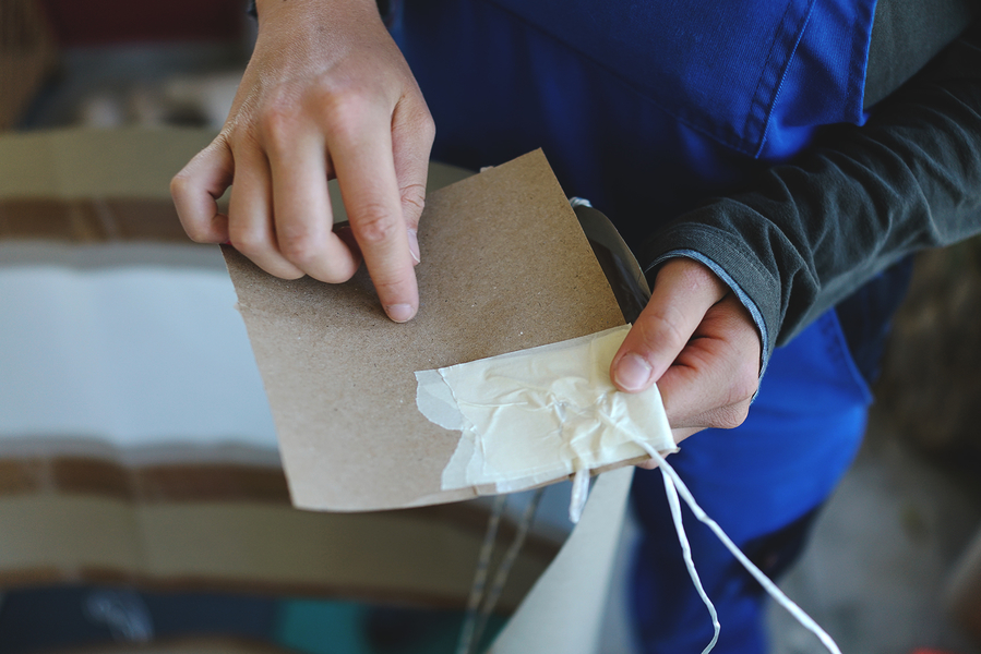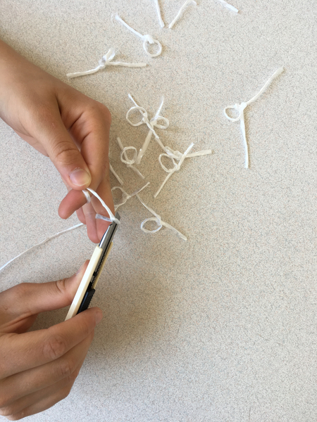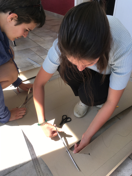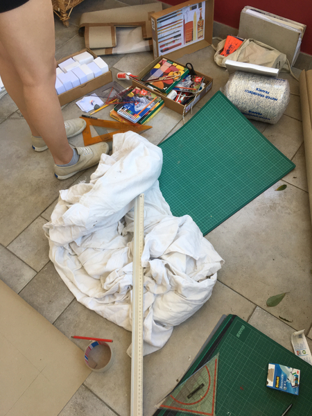 Bei der Umsetzung unseres Projekts gab es eine Frage, der eine entscheidende Rolle eingenommen hat; wie gelingt es Papier an Fäden, deckend über einen Platz zu spannen, ohne dass der Wind die segelähnliche Konstruktion davonträgt. Dies war einer der Gründe, weshalb die Anfangsidee einen Plane aus einzelnen A4-grossen Papieren zu nähen aufgegeben wurde. Ein weiterer war, unsere Befürchtung, dass sich das spärlich durch Zwischenräume der Naht brechende Licht verteilt hätte ohne klare, dramatische Schattenkanten zu werfen. In einem zweiten Anlauf kamen wir darauf, einzelne Elemente aufzuspannen und zu einem Dach überlappen zu lassen. Einer der grossen Papierrollen nahmen wir Stücke der Längen 1,2m und 1,8m ab und schnitten Rillen/Fenster ein, durch die das Licht fallen kann. Als wir einen ersten Prototyp in der Luft aufspannten war sofort klar, dass er nicht stabil genug war. Der Wind riss an der löcherigen Fläche und obwohl die wir dachten die Rillen wären von Vorteil, da so Luft nicht aufgehalten, sondern hindurchfliessen konnte, reichte die Windkraft aus das Papier zu zerreissen. Tatsächlich, schien es nämlich so, als hätten die riesigen Einschnitte in die Spannkraft des Papiers gebrochen, welches nun als loser Rahmen umherflatterte und so an den Schnittkanten anfällig für Risse war. Trotz der Verstärkung der Eckpunkte, gruben sich die Schnüre, welche wir dort befestigt hatten um das Dachelement aufzuspannen durch das Papier bis an den Rand und einen Moment lang verloren wir die Hoffnung an unserem Projekt. Wie bloss sollten wir unser Dach jetzt aufhängen? Herr Bali brachte die Lösung: Aus Silch knotete er eine kleine Schlaufe und befestigte diese dann mit mehreren Schichten Klebeband an beiden Seiten des Papiers. Er hatte eine Niete eingebaut! Wie bei einer grossen Plastikplane es die eingepressten Metallringe tun, verteilte der Silchring die Zugkraft der Schnur auf eine grössere Fläche. Dank dieser genialen Konstruktion schöpften wir neuen Mut und kamen auch auf eine Lösung, den restlichen Rahmen stabiler zu machen. Kürzere und auf der Innenfläche verstreutere Rillen, schufen breitere Zwischenbahnen im Papier, mit mehr Resistenz gegen den Wind. Zu guter Letzt kam gab uns Herr Alberten noch den gedanklichen Anstoss, man müsse das Material im die Fenster gar nicht komplett ausheben und zu Müll machen, sondern es genüge auch schon drei Einschnitte zu machen und das Papier an einer Rillenkante wegzuknicken. Mit diesem letzten Element, konnten wir schliesslich das “falten und fallen” auch ins Projekt einbringen und verdeutlichen. Denn die herabhängenden Streifen, falteten wir gegen das Dach zurück, was diesem den abstrakten Anschein einer Haut verleiht, die von gewaltigen Krallen aufgezehrt wurde. Die Krallen der Menschheit könnte man meinen die Löcher in unser Himmelsdach reissen, welches nun netzartig und vielschichtig über uns aufgespannt ist. Obgleich ihre Botschaft so trist ist, schafft unsere Installation einen friedlichen Raum in dem man sich niederlassen und den wandernden Grenzen von Licht und Schatten zuschauen kann.