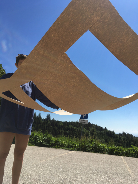 Heraufspaziert auf die Licht/Schatten Terrasse! Aber Spuren bitte draussen lassen! Mit Hilfe von Papierplanen, Schnüren und einer Menge Klebeband, haben wir ein Dach konstruiert und somit einen Raum geschaffen, der zum Nachdenken über das Zusammenspiel zwischen menschlichen Schaffen und der Natur anregt.