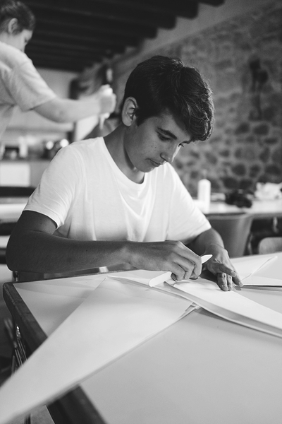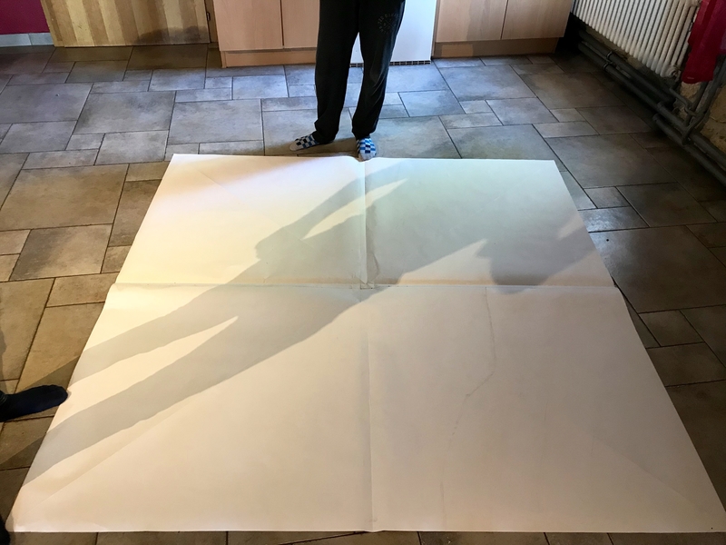 Für Origami-Falten braucht man nicht viel – lediglich Papier. Jedoch brauchten wir viel Papier, da die tatsächliche Grösse des Drachens etwa ¼ der originalen Papiergrösse beträgt. Wir brauchten ca. 12m2 Papier. So konnten wir sechs Drachen in verschieden grosse Varianten eines Origami-Drachen herstellen. Durch den Einsatz von transparenten Silchschnüren kreierten wir die Illusion, dass die Drachen fliegen können. Diese Illusion wird zusätzlich durch den Wind und die aufsteigende Heissluft des Feuers verstärkt.