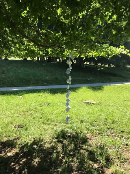 Nach einigen Faltversuchen entschieden wir uns für eine einfache Schachtel. Da wir nicht wussten wie viele Stücke wir für unser Projekt benötigen würden, fiel unsere Entscheidung auf einen solch einfachen Körper. Während mehreren Stunden fertigten wir 50 Schachteln an. Anschliessend machten wir uns mit unseren Materialien auf den Weg in Richtung unseres sogenannten „Märchenbaums“. Dort teilten wir die Aufgaben untereinander auf. Jemand befestigte die Körper am Silk, ein anderer hängte diese auf und die dritte Person achtete darauf, dass die Schachteln ungefähr auf der gleichen Höhe aufgehängt werden.