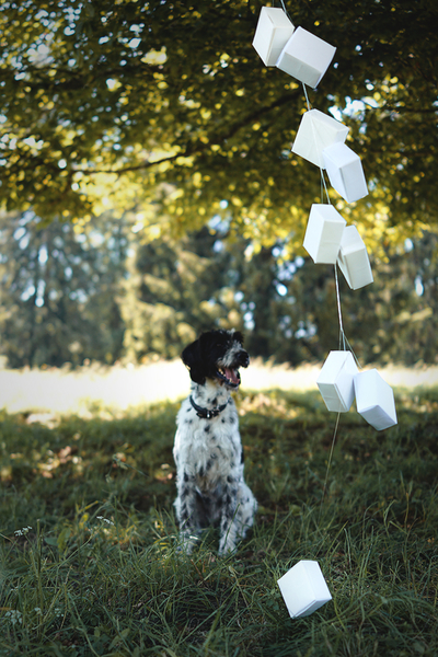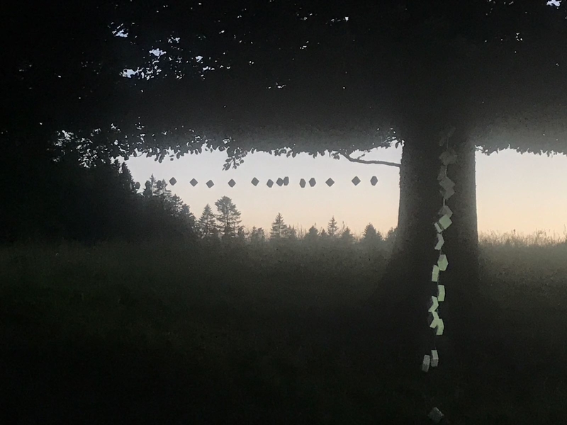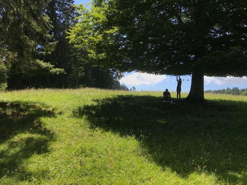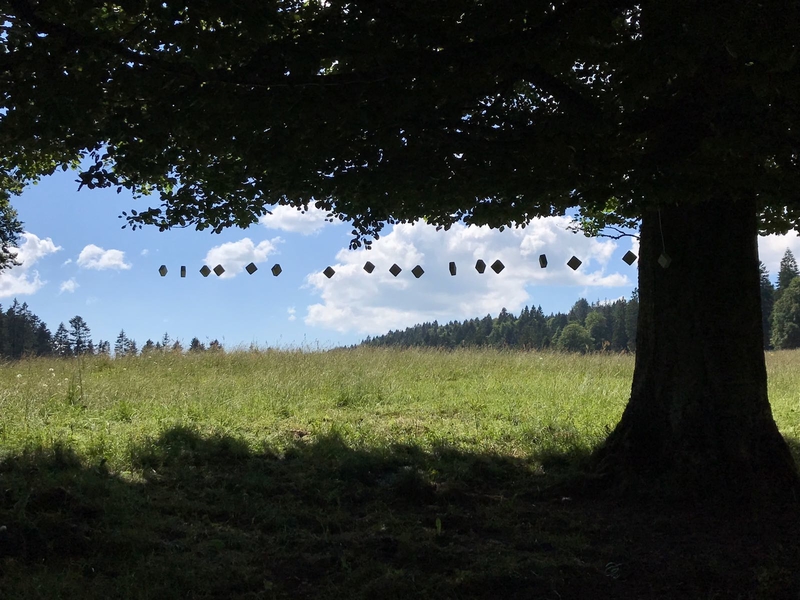 Mithilfe von Papier wollten wir eine neue, strukturierte Ebene schaffen. Dazu suchten wir einen Baum, dessen Blätter eine Parallele zum Boden bilden. Dazwischen sollte genügend Freiraum für unsere Formen sein. Ein weiteres Kriterium war die Landschaft im Hintergrund. Damit unsere gehängte Ebene sichtbar ist, eignete sich der strahlend blaue Himmel dafür sehr gut. Der Hauptbestandteil unseres Projekts bestand darin, die Papierschachteln der Natur auszusetzten und somit dem Zufall zu überlassen.