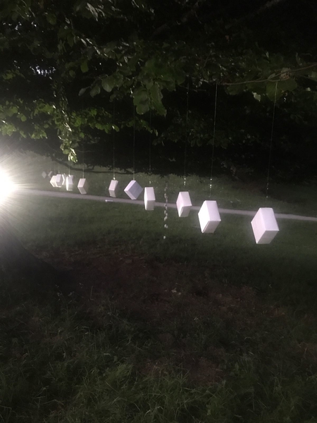 Um möglichst viele Eindrücke sammeln zu können fotografierten wir unser Projekt zu unterschiedlichen Tageszeiten. In der Nacht bot sich uns ein schönes Wind- und Schattenspiel. Den Schatten erzeugten wir mit einer Taschenlampe. Je nach Einfallswinkel des Lichts und der Distanz aus der wir die Schachteln bestrahlten, entstanden sehr interessante Bilder.
