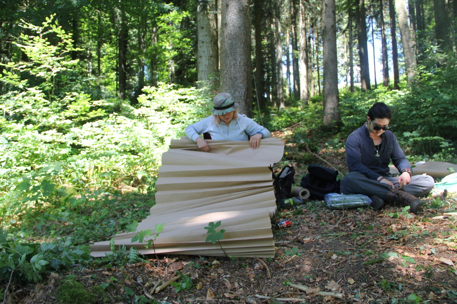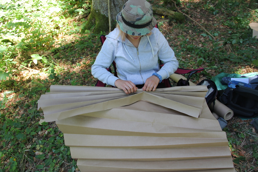 Unsere Absicht war es einen Naturbezogenen Rück-zugsort für uns aufzustellen und ihn mit verschiede-nem Naturfarbigem Papier und Seil zu dekorieren.