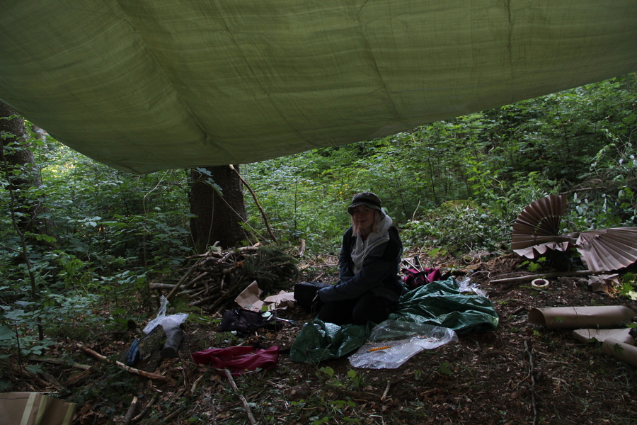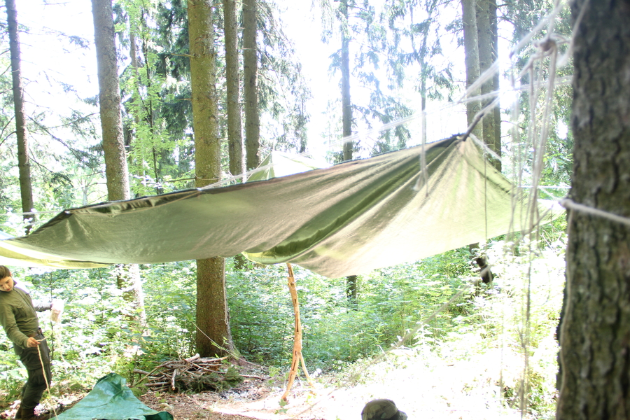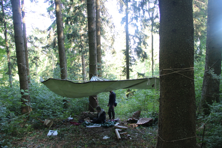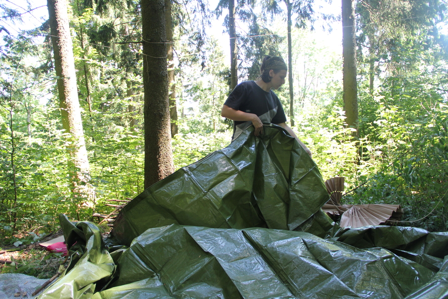 Bei der Umsetzung unserer Ideen sind uns allerdings einige Probleme in den Weg gekommen. Unsere Gir-landen zum Beispiel sind am Mittwoch vom Regnen davongeschwemmt worden, wir retteten Jedoch noch alle die wir konnten. Trotzdem sind Stunden von Ar-beit verloren gegangen. Bei der Schutzblache hatten wir das Problem, dass unsere Seile nicht genug Druck aushielten um unser Dachkonstrukt zu halten. Darauf mussten wir teilweise mit doppelt ausgelegter Schnur arbeiten um Stabilität zu gewährleisten, als auch das nicht genug war entschieden wir uns die Blache mit einem Stützpfeiler in die höhe zu heben, in unserer Umgebung hatte es allerdings keine Äste welche hoch genug wären, kurzerhand haben wir einen Haufen kleine Äste zusammengeklebt und diese als Masten verwendet. Der Traumfänger wurde ebenfalls von dem Regenschauer beschädigt und trägt nicht mehr die gleiche Spannung. Beim machen des Storens hat-ten wir plötzlich das Problem das man die gefalteten Storen nicht mehr in die Hand nehmen konnte da sie von den einzelnen Falten zu dick waren. Darauf ha-ben wir das Papier vorne abgeschnitten und fuhren von der Hinterseite damit fort. Die Konstruktion des Tores erwies sich als zu Aufwändig, also beschlossen wir uns das wir das nur zu machen wen noch genug zeit übrig bleibe. Alles andere verlief jedoch so gut wie Reibungsfrei und wir haben trotz viel mühe und Ent-täuschung einen schönen Aufenthaltsort aufgestellt.